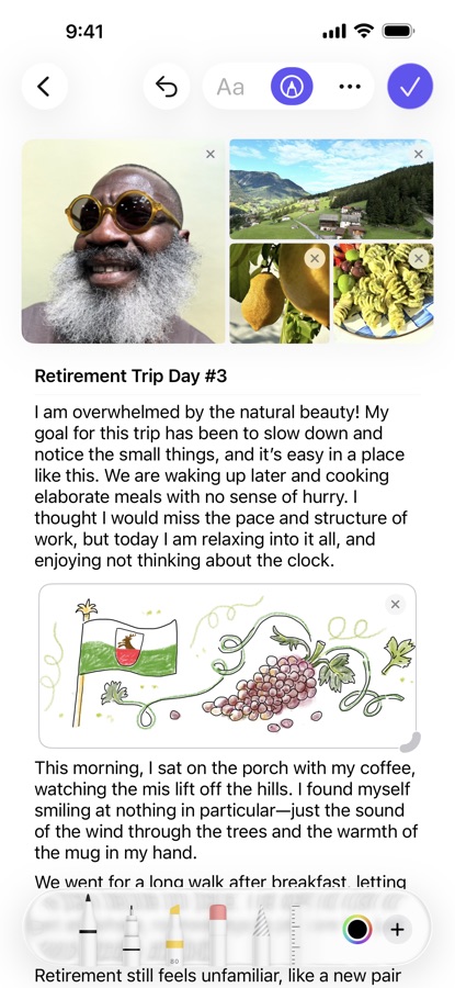 • Давайте волю творчеству, рисуя надписи, наброски и графические элементы пальцем или с помощью Apple Pencil на iPad. А чтобы сделать свой дневник еще более личным, добавляйте записи от руки.