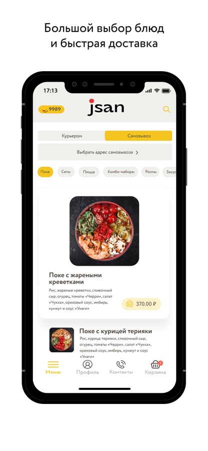 Как сделать заказ в приложении «JSan»: выберите понравившиеся позиции из меню, добавьте их в корзину и перейдите на экран оформления заказа (по нажатию на иконку корзины).