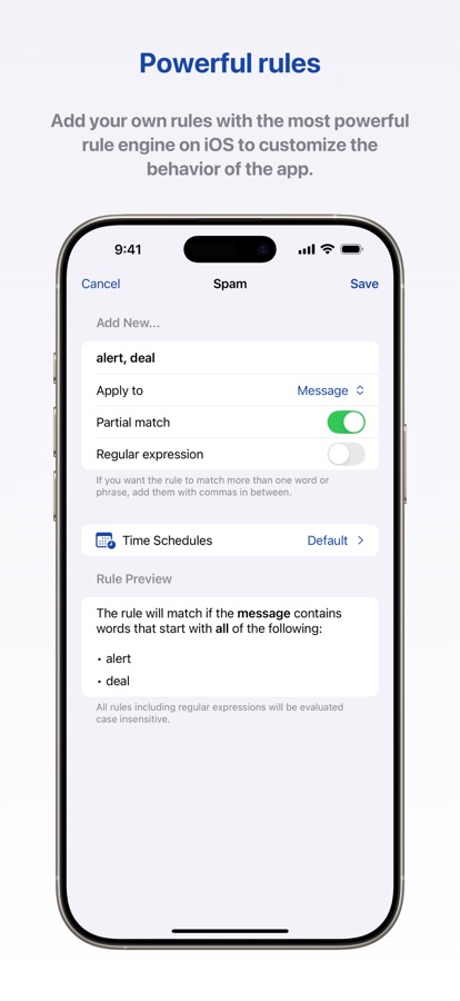 The rule lists let you write much more powerful rules than most of the competing apps. They can work on both the sender or the content of a message and they accept any input including regular expressions (Regex). They are also simpler to manage than other apps.