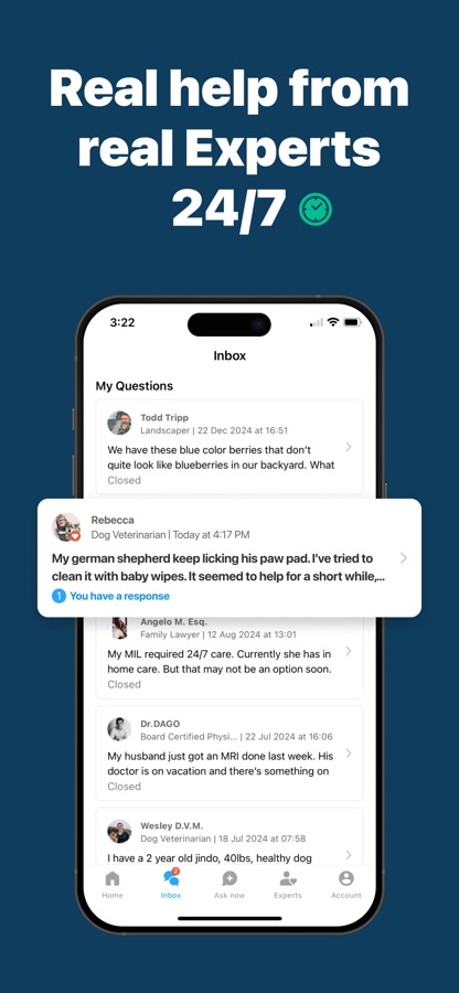 — Ask questions in 700+ professional specialties including legal, medical, pet care & more.
