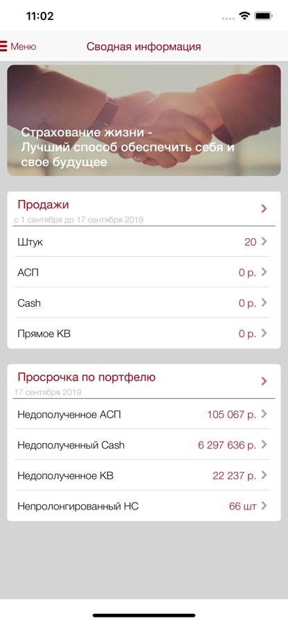 Информация о портфеле договоров (данные по договорам страхования, данные о возможных пролонгациях и кросс-продажах, фильтры по статусу, информация об уровне дебиторской задолженности и очередных взносах);