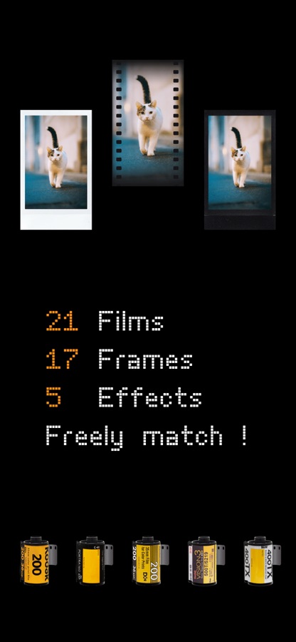 Kada Cam includes Films, Frames, Effects. You can freely match the combination of the three to customize your own vintage camera. You can also import photos for editing and apply the effects.
