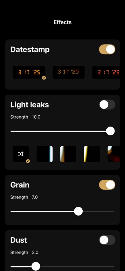 — Effects: Provide 5 kinds of film effects: Datestamp Watermark, Dust, Grain, Light Leaks and Colour Leaks.