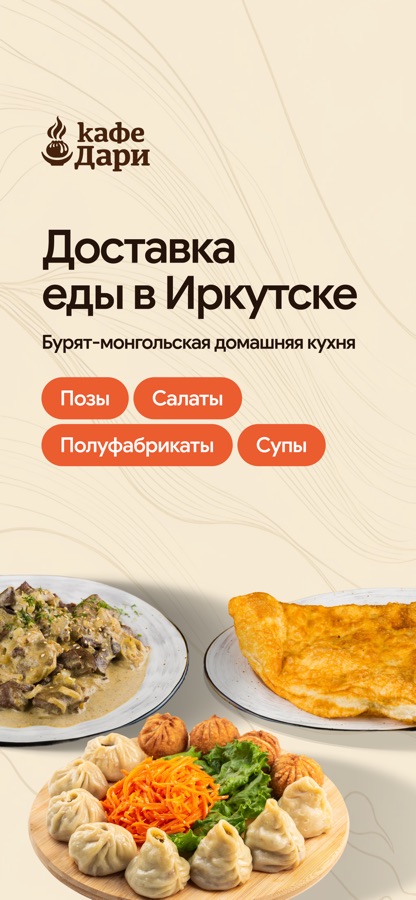 Дари — это сеть кафе и доставка еды в Иркутске. Вкусная домашняя кухня, полуфабрикаты и любимые блюда бурят-монгольской кухни. Натуральные продукты и высокие стандарты качества. Бесплатно доставляем в Иркутске.