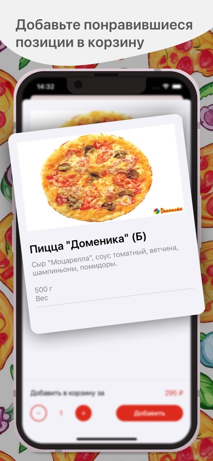 Как сделать заказ в приложении “Кафе Доменика”: выберите понравившиеся позиции из меню, добавьте их в корзину и перейдите на экран оформления заказа (по нажатию на иконку корзины).