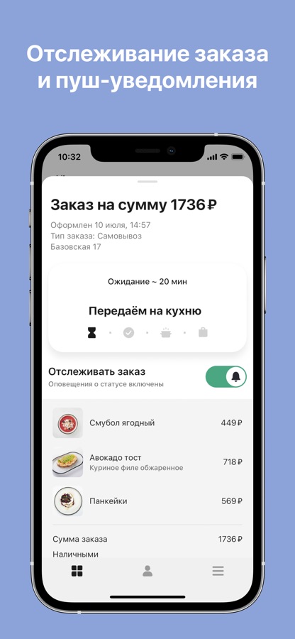 Приложение имеет простой и интуитивно понятный интерфейс, который позволяет пользователям легко выбирать и заказывать свои любимые напитки и блюда. После оформления заказа пользователи могут отслеживать его статус и узнать примерное время доставки.