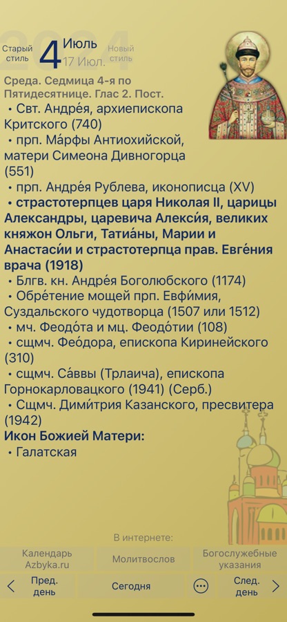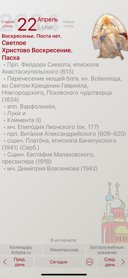 Полный православный церковный календарь от портала «Азбука веры», на каждый день года, с месяцесловом (житиями святых и иконами).
