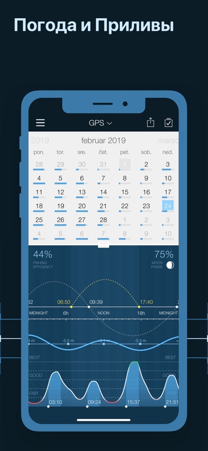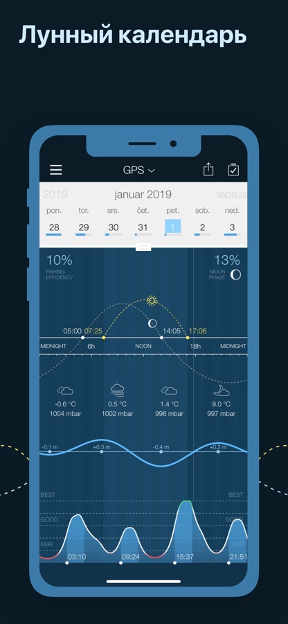 «Календарь рыболова» – это новейший программный продукт Solunar, предсказывающий наилучшее время для ловли рыбы в любом месте и в любое время. Каждый рыболов знает, что лучшее время клёва – это когда рыба питается, как правило, на закате и на рассвете. Но клёв зависит и от других факторов. «Календарь рыболова» поможет вам увеличить улов! Эта мощная прикладная программа позволяет фотографировать улов, вводить его описание, размер, вес, погоду при ловле, наживку и т.д., и на основе этой информации постороить свою базу данных. Вы даже можете обмениваться уловом с друзьями!