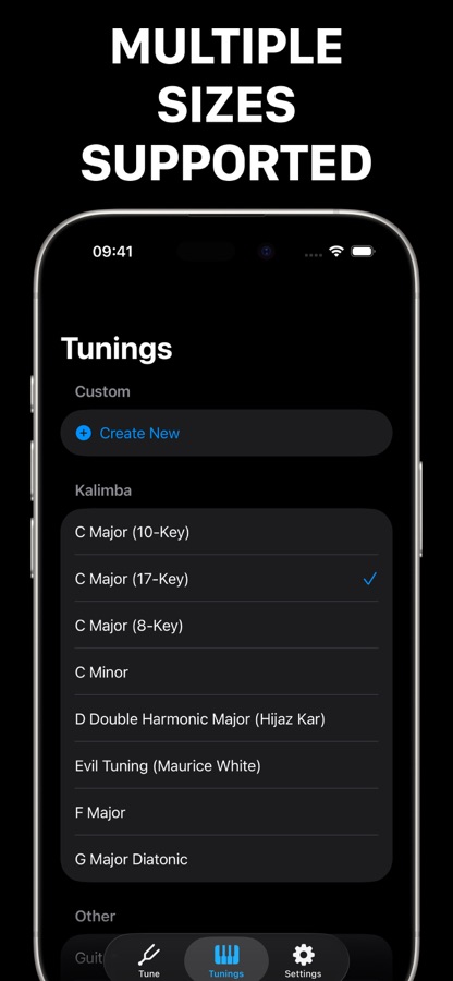 Choose from a selection of built-in tunings for kalimba and other instruments.