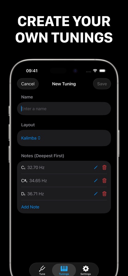 Kalimba Tuner is an accurate and fully customizable tuning app for kalimba and many other instruments. Choose from a selection of built-in tunings or create your own. Custom tunings can be adjusted down to the exact frequency in hertz.