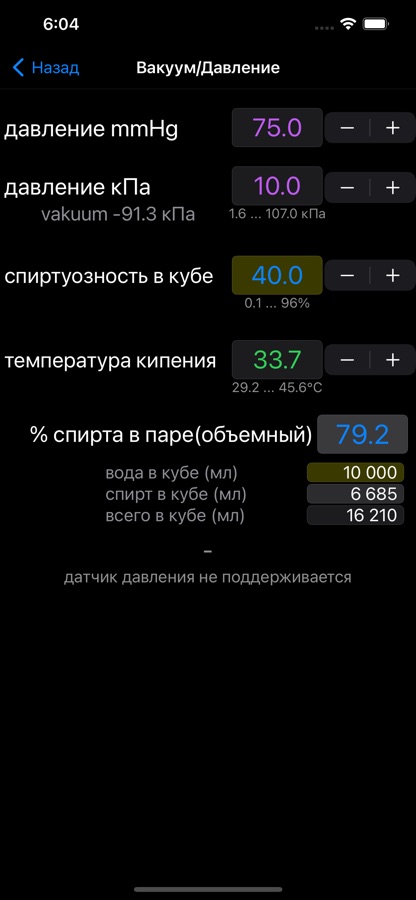 + расчет температуры кипения и спиртуозности под вакуумом(пониженном давлении в системе)