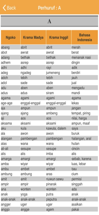 Aplikasi Kamus Bahasa Jawa Indonesia Lengkap (Terjemahan/Translate). Berisi kumpulan kosakata Bahasa Jawa yang diterjemahkan ke Bahasa Indonesia, serta kosakata Bahasa Indonesia yang diterjemahkan ke Bahasa Jawa (Ngoko, Krama Madya, & Krama Inggil). Juga dilengkapi dengan aksara jawa, pasangan, sandhangan, hingga aksara angka.
