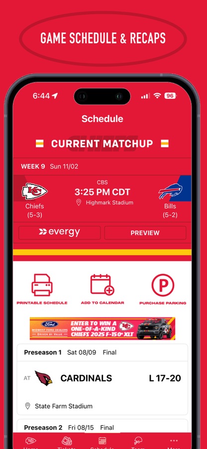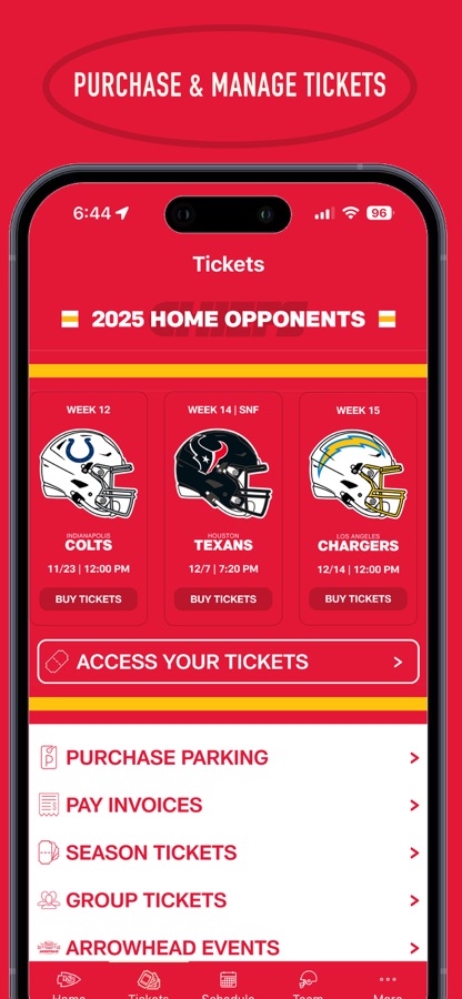 Chiefs Mobile is the official app of the Kansas City Chiefs. Chiefs Mobile keeps you connected to the Chiefs Kingdom 365 days a year with team news, updated rosters, stats and injury reports. Enhance your game day experience with mobile ticketing, in-stadium messaging, in-app 50/50 ticket purchasing and more!