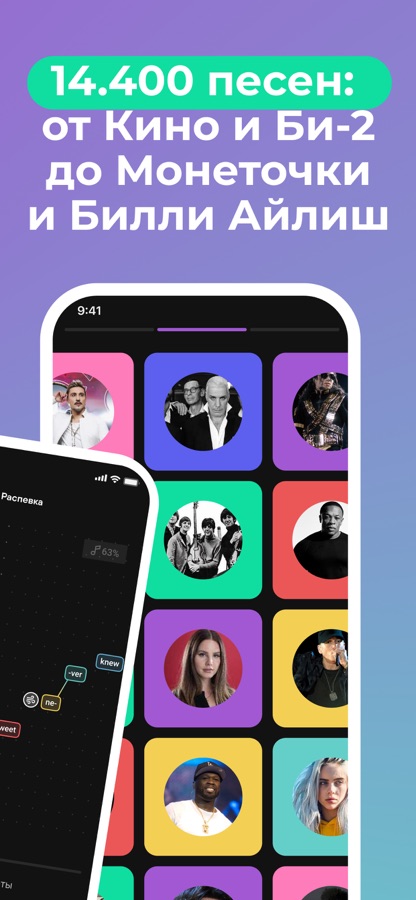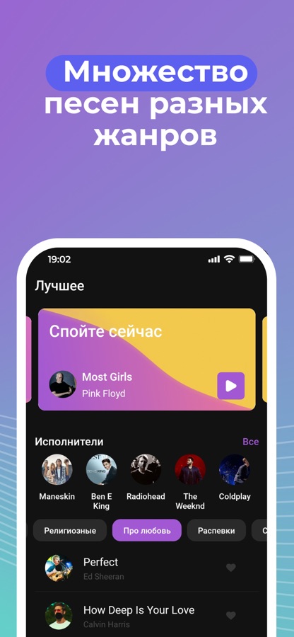 Песни в приложении легко подстраиваются под ваш голос, чтобы вам было удобно петь.