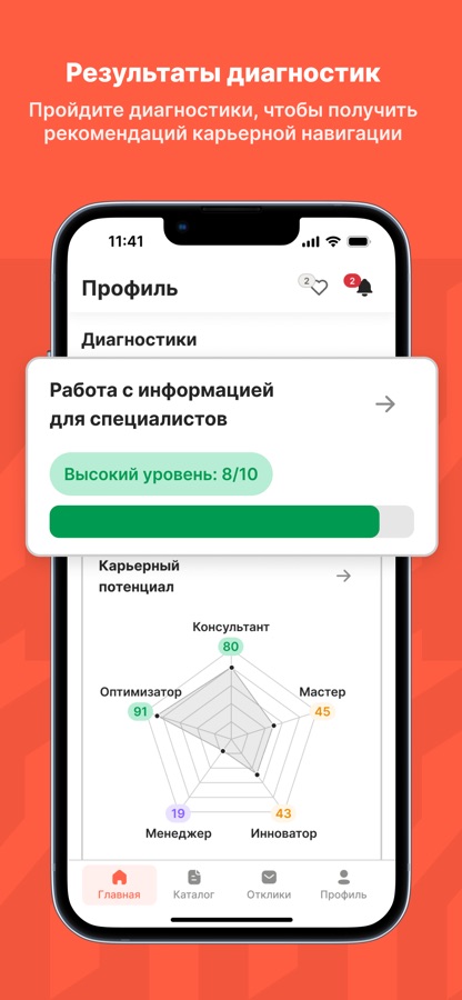 — Профессиональная навигация. Пройдите комплексную диагностику способностей и карьерного потенциала и получите подборку стажировок, мероприятий и вакансий. Всё для того, чтобы вы могли уверенно двигаться в нужном направлении.