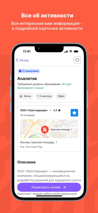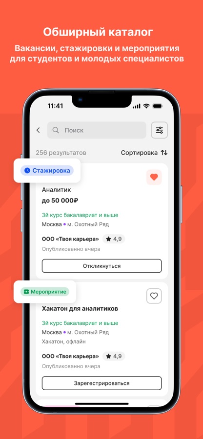 — Взаимодействие с работодателями и учебными заведениями. Откликайтесь на вакансии и стажировки, участвуйте в мероприятиях. Получайте обратную связь от компаний. Учебные заведения отслеживают ваш карьерный трек, поддерживают связь с вашим работодателем и рекомендуют подходящие карьерные возможности.