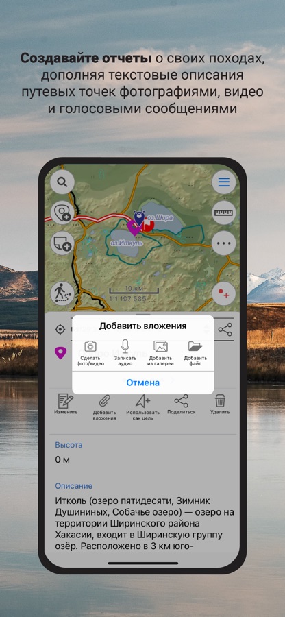 Сохраняйте всю важную для вас информацию о походе или прогулке непосредственно в приложении! Делайте пометки, наносите на карту точки, линии и полигоны, добавляйте к ним фотографии, видео ролики и голосовые комментарии, чтобы составить информативный отчет о своем приключении. По возвращении домой вы сможете легко поделиться ценной информацией с друзьями и коллегами.