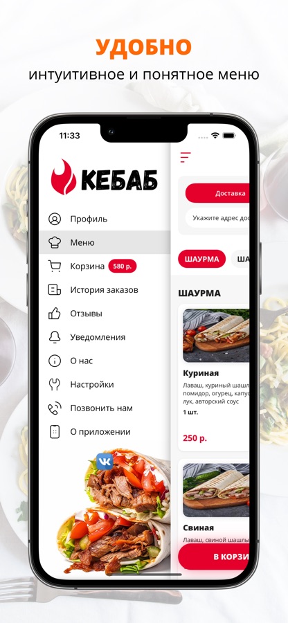 Приложение КЕБАБ — это удобный способ заказа еды домой или в офис. Всегда в нашем меню — вкусные шашлыки, шаурма, курица гриль.