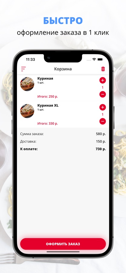 Скачивайте наше приложение, оформляйте заказ и наслаждайтесь любимой едой, где бы Вы ни были! Приятного аппетита!