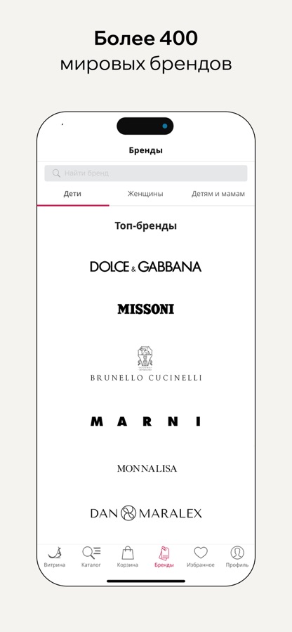 Комфортный онлайн-шопинг для детей и мам: брендовая одежда Dolce&Gabbana, Stella McCartney, Emporio Armani, Moschino, Diesel, Monnalisa. Dsquared2, N21, MSGM, Brunello Cucinelli, Marni, Alberta Ferretti, Missoni, Philosophy di Lorenzo Serafini, Roberto Cavalli, Diesel, MM6 Maison Margiela, Mo5ch1no Jeans, Twinset, Vivetta 120%Lino, Charo Ruiz и еще более 500 коллекций брендовой женской одежды, детской одежды и товаров для мам и детей.