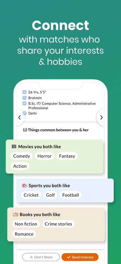 Now connect with eligible singles across the world who share your hobbies and interests. With a wide range of interests, match with brides and grooms based on interests like cooking, pets, photography, singing, social media, going on long drives and more.