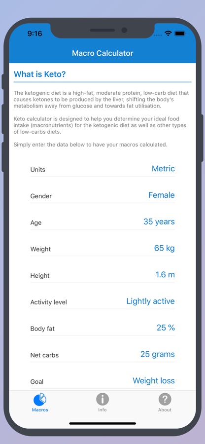 Keto Calculator is designed to help you determine your ideal food intake (macronutrients) for the ketogenic diet as well as other types of low-carbs diets.