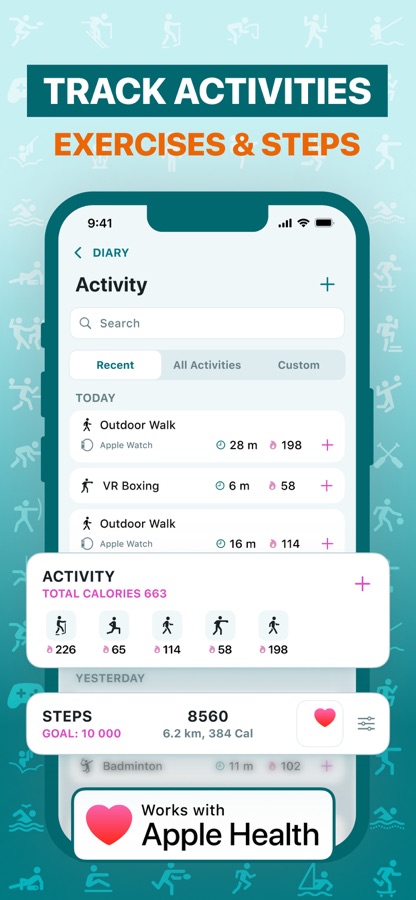 Наше приложение использует HealthKit. Вы можете легко перенести данные из Apple Health в наше приложение, чтобы отслеживать калории и шаги, а также физическую активность.
