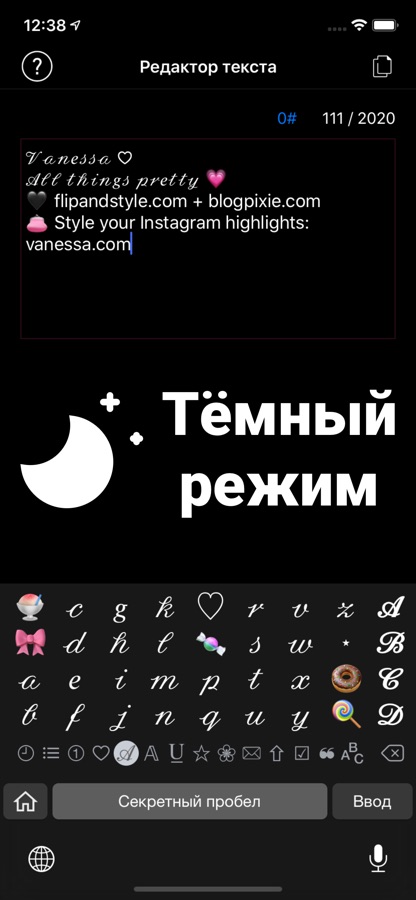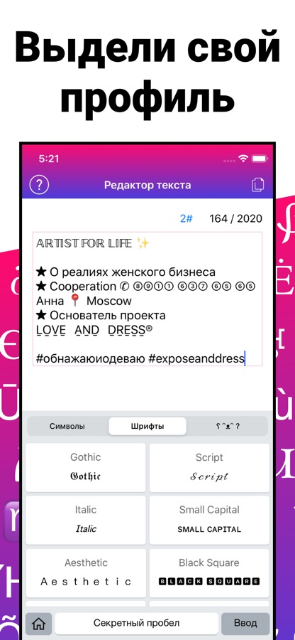 Создавайте креативные тексты, используя клавиатуру, разработанную для Инстаграм. А с помощью редактора текста следите за количеством символов и хэштегов.