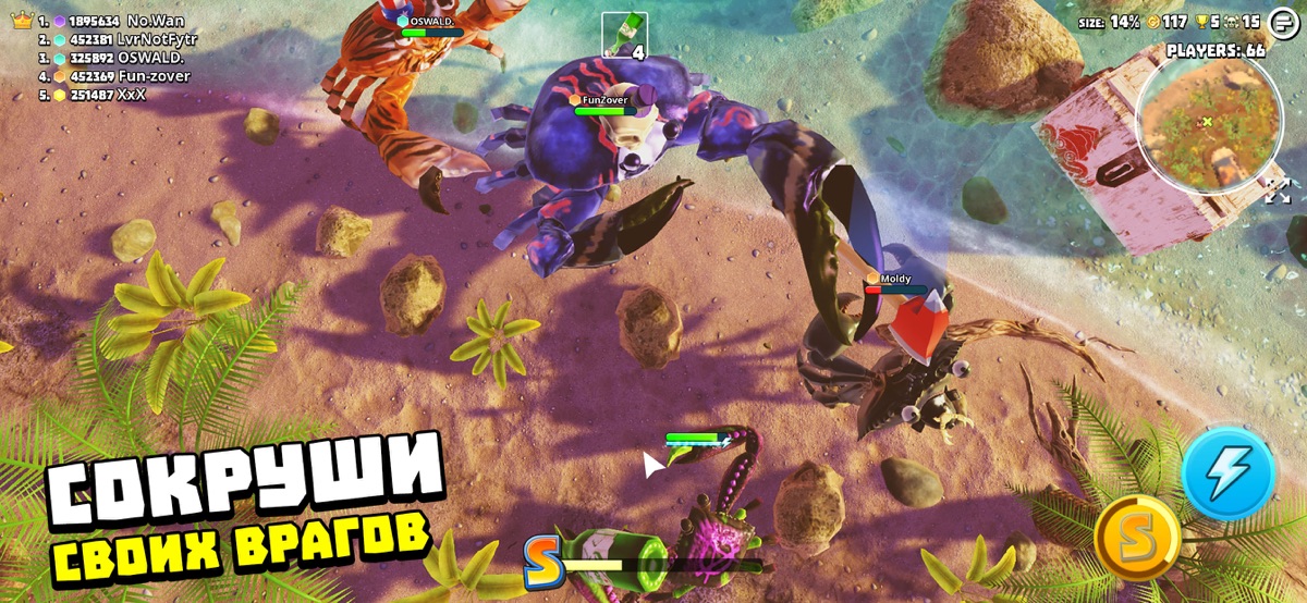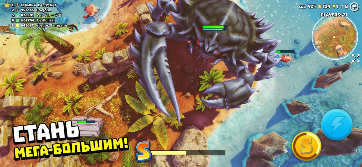 Пробивайтесь вперед, расчищайте свой путь и уничтожайте соперников, чтобы стать Королем крабов!