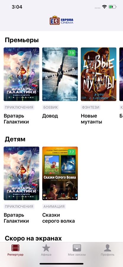 Мобильное приложение кинотеатра Европа Синема поможет вам подобрать удобный сеанс, узнать о новинках кинопроката и приобрести билеты в кино.