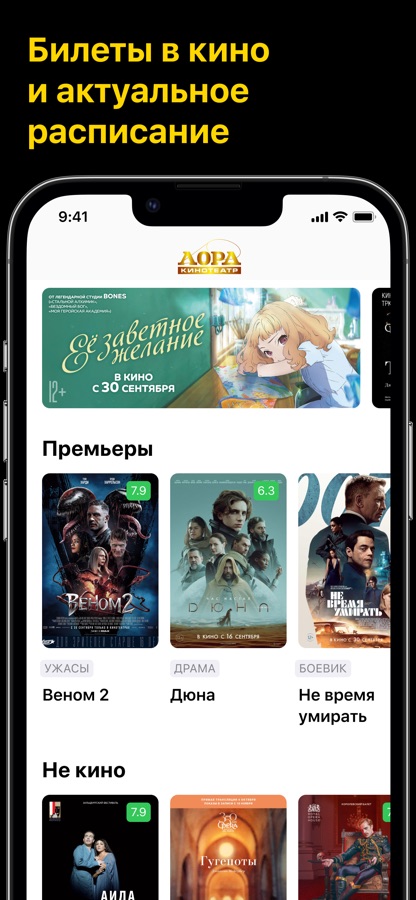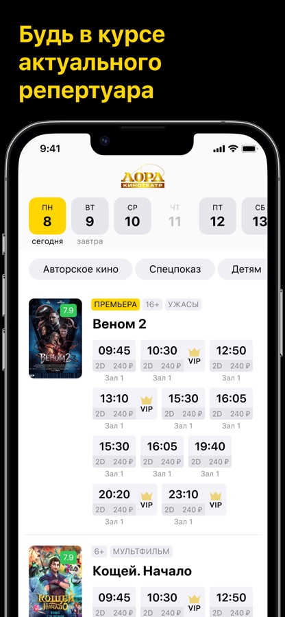 Мобильное приложение кинотеатра «Лорд» поможет вам подобрать удобный сеанс, узнать о новинках кинопроката и приобрести билеты в кино.