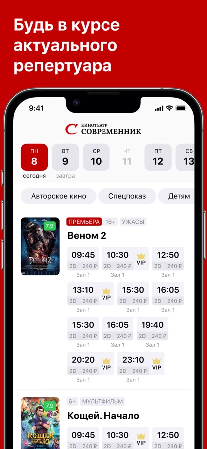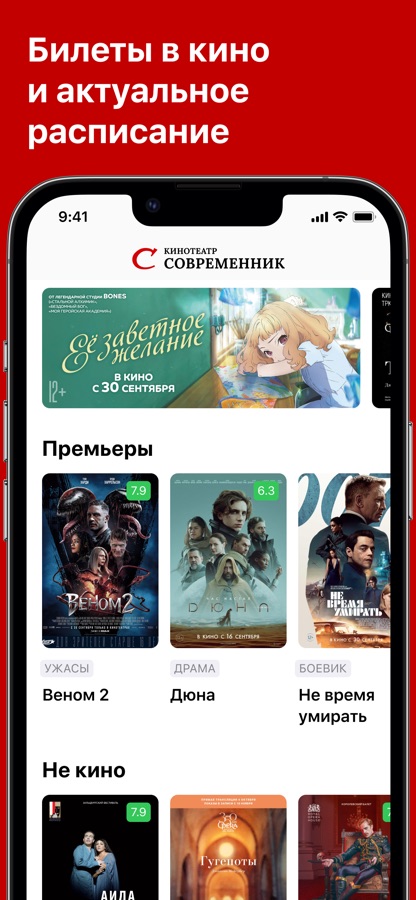 Мобильное приложение кинотеатра «Современник» поможет вам подобрать удобный сеанс, узнать о новинках кинопроката и приобрести билеты в кино.