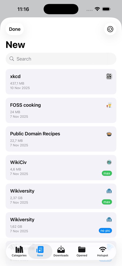 Support us! Kiwix is a non-profit and displays no ads nor collects any data. Feel free to donate here: https://kiwix.org/en/get-involved/#donate OR use Apple Pay for donations, it can be accessed from: Settings (scroll down) -> Misc: Support Kiwix.