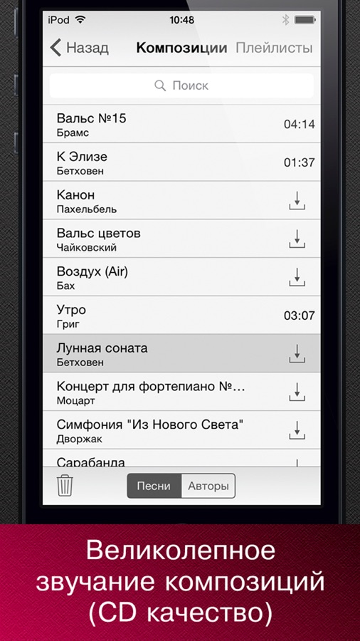 Главное преимущество приложения — возможность слушать классическую музыку даже без подключения к сети Интернет. Достаточно один раз закачать понравившуюся композицию, и вы сможете прослушать ее во время долгих перелетов и на отдыхе.