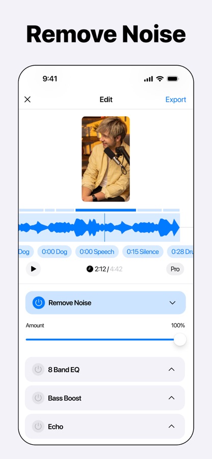 Быстро удалите шум с видео. Уберите ветер и фоновый шум, сделайте тихие клипы громкими и отполируйте звук про-инструментами. Экспорт за секунды — идеально для Instagram Reels, Stories и TikTok.