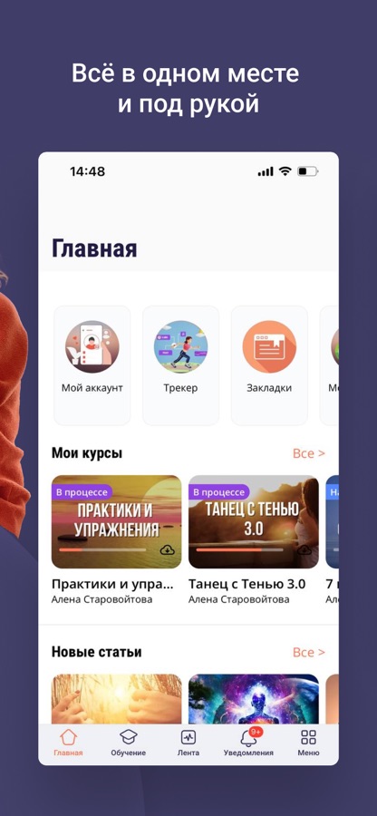 Внутри приложения статьи, медитации, записи трансляций Алены Старовойтовой, бесплатные вводные курсы, а также сообщество единомышленников.