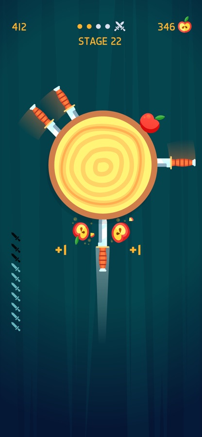 Throw the knives into the logs to break them. Slash the apples and unlock new knives. Each 5th stage is defended by a boss — beat them to get exclusive knives!