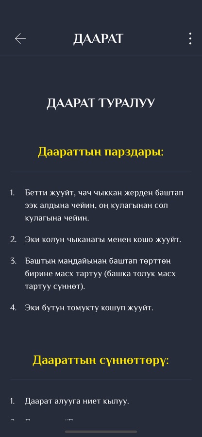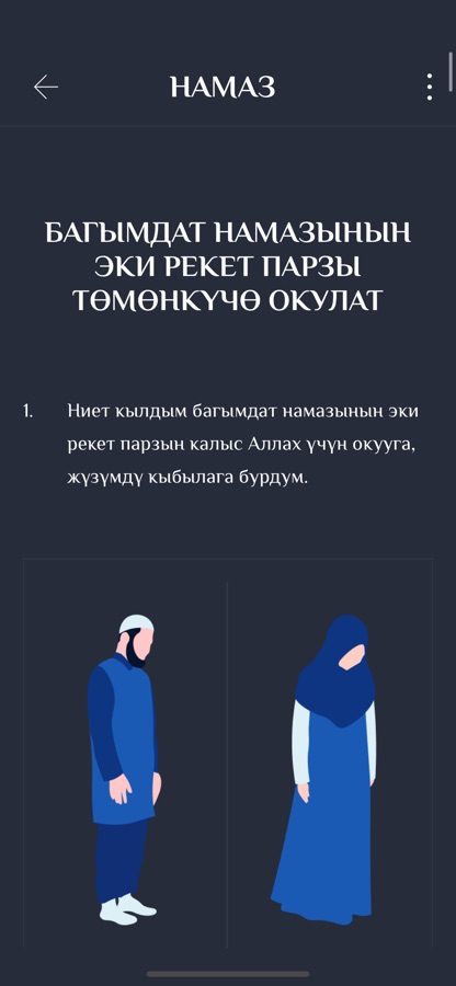 Ханафи мазхабы боюнча намаз окууну үйрөнүү. Китептеги материалдар муфтият тарабынан колдонулууга уруксаат берилген китептерден алынган. Кыргызстан 2016.