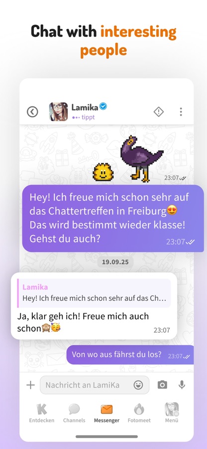Are you looking for new friends, exciting chats, flirts or your big love? Then you’re sure to find what you’re looking for because Knuddels has been bringing people together for over 20 years. Over 330,000 monthly active users are just waiting to finally meet you.