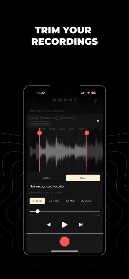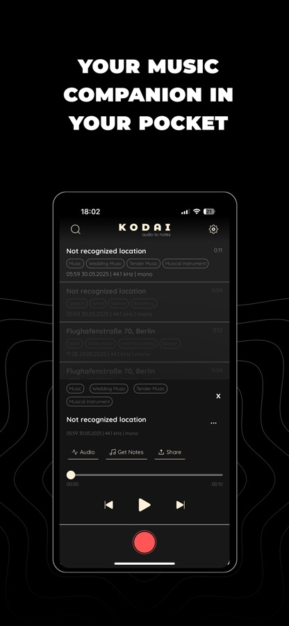 Record directly in the app, visualize your music with an interactive MIDI preview and collaborate easily with others. Kodai gives you the tools to bring your musical ideas to life — whether you’re composing at home or on the move.