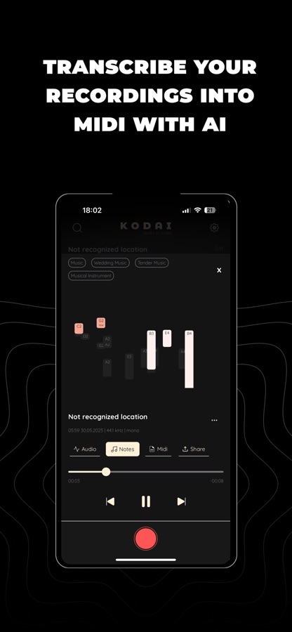 Kodai helps you capture, transcribe, and share your music faster. Built for musicians and songwriters, Kodai transforms your recordings into structured MIDI files using advanced AI transcription.