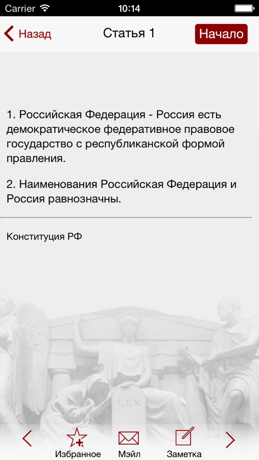 — Возможность покупки только тех текстов законов и статей, которые вам нужны. В основном меню названия кодексов и законов, тексты которых предоставлены бесплатно, или которые вы уже купили — красного цвета;