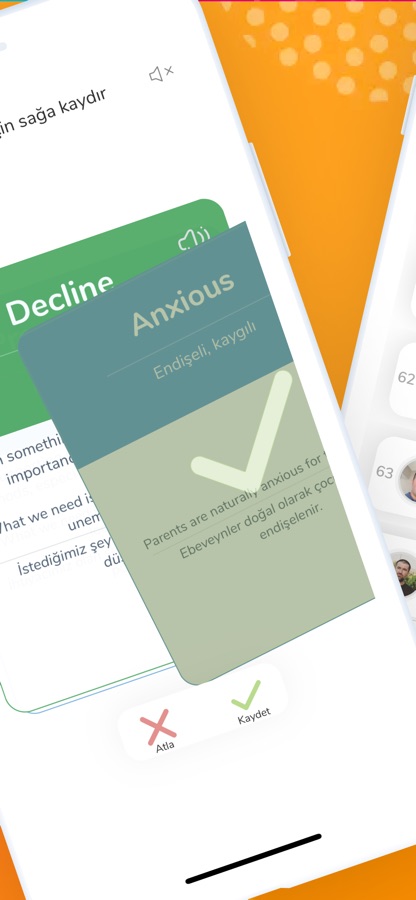 Kelimelerin anlamlarını ve örnek cümle içinde kullanımlarını incele, kaydetmek istediğin kelimeler için sağa kaydır. Bunlar daha sonra tekrar etmen için karşına çıkacak unutma :)