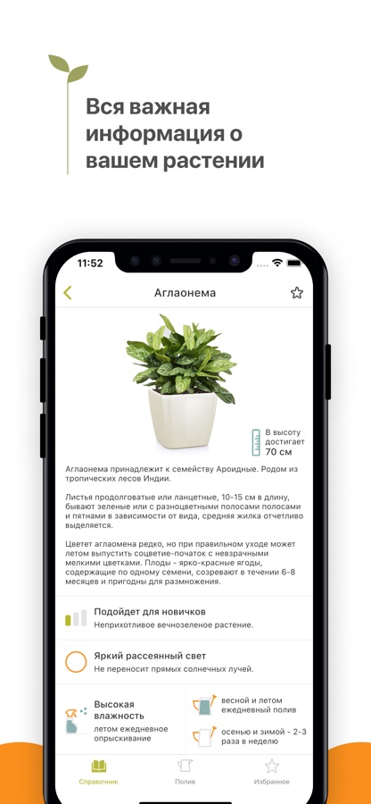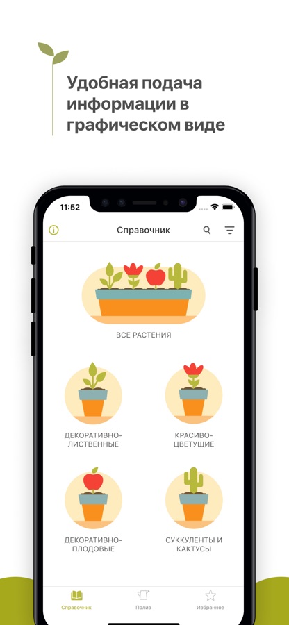 Справочник по уходу за домашними растениями еще никогда не был таким удобным. Мы проработали дизайн таким образом, что вам не нужно пробираться через вереницу длинных текстов, чтобы узнать, как часто нужно поливать ваших оконных питомцев, сколько нужно солнечного света и как можно размножить растения. Вся информация представлена в удобном графическом виде с минимумом текста. Просто взгляните на экран и у вас не останется вопросов.