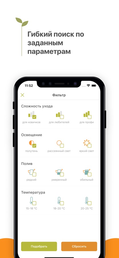 * Категоризация с возможностью подбора растений по заданным параметрам — уровню освещенности, легкости ухода, частоте полива и другим