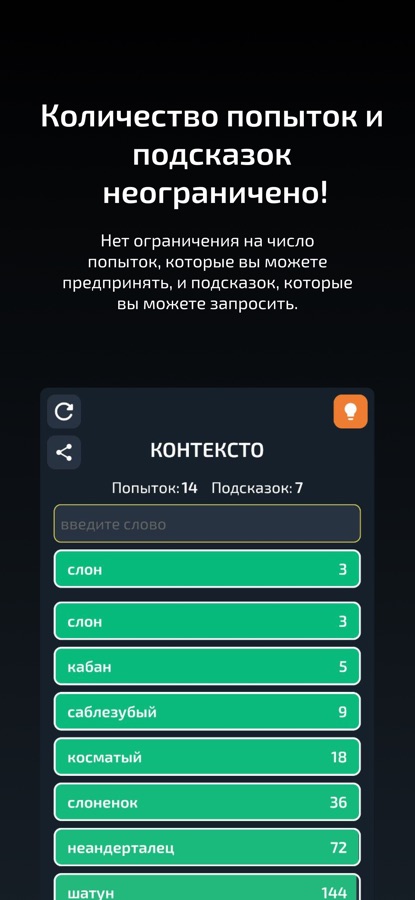 Контексто — это уникальная игра в слова на русском языке, которая развивает вашу логику и эрудицию. Ваша цель — угадать секретное слово по подсказкам, которые подбирает для вас искусственный интеллект. Подсказки отражают смысловое сходство слов с загаданным словом. Чем меньше номер подсказки — тем ближе вы к правильному ответу. Используйте свое знание русского языка и контекста, чтобы решать головоломки. Играйте каждый день и улучшайте свой словарный запас и понимание текстов. Соревнуйтесь с друзьями и другими игроками по всему миру. Контексто — это игра для тех, кто любит русский язык и слова!