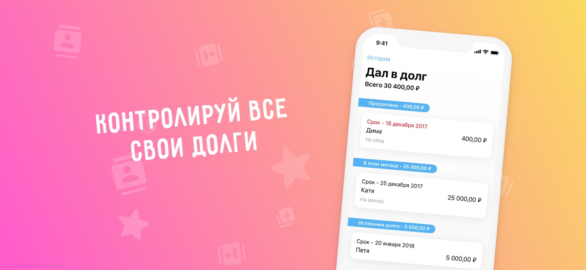 Приложение «Контроль долгов» позволяет вести учет долгов в ситуациях, когда вы должны кому-то деньги или их кто-то должен отдать вам.