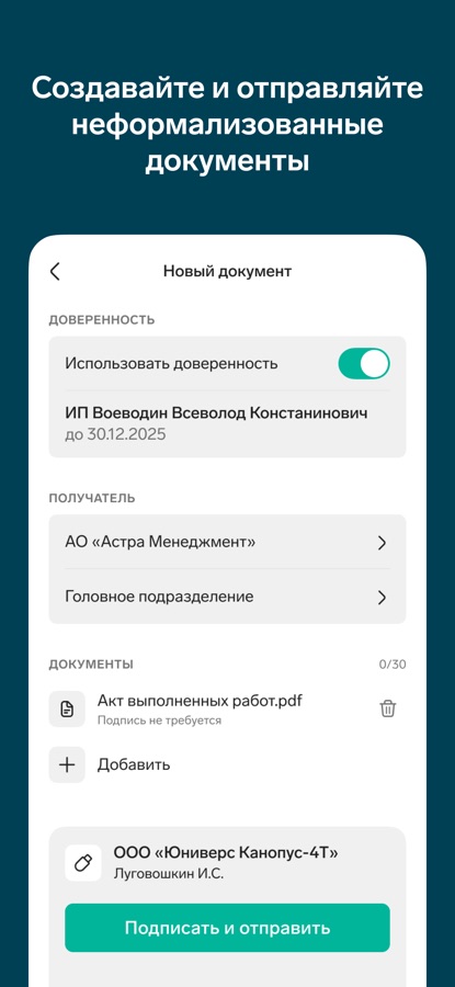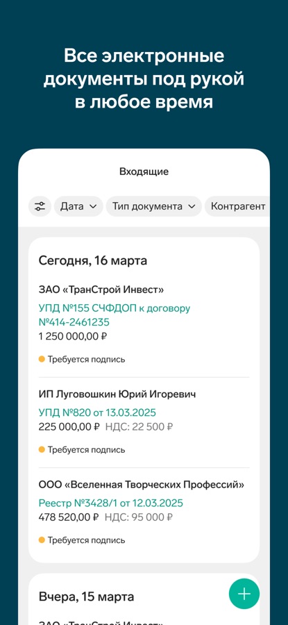 Держите документооборот организации всегда под рукой. Приглашайте к обмену новых контрагентов. Проверяйте основную информацию по сделке, историю и комментарии перед подписанием документа.