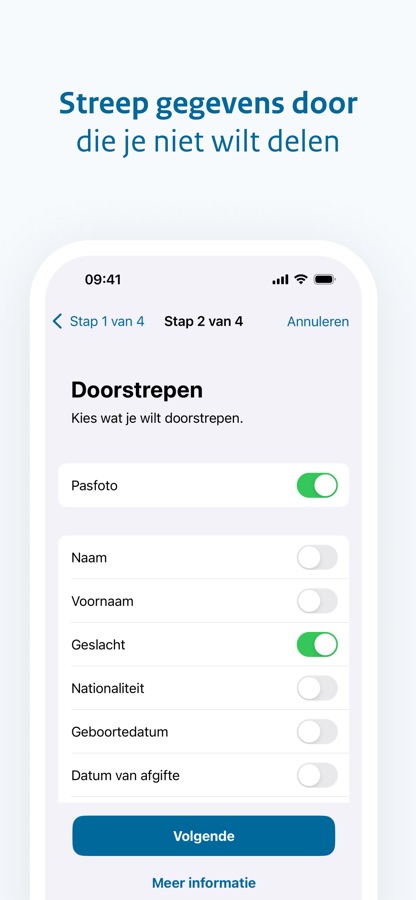 Met de KopieID-app kun je zelf een kopie maken van je identiteitsdocument en selecteren welke gegevens de app moet doorstrepen. Na het doorstrepen en het plaatsen van een watermerk kun je de kopie delen met derden of de kopie opslaan.
