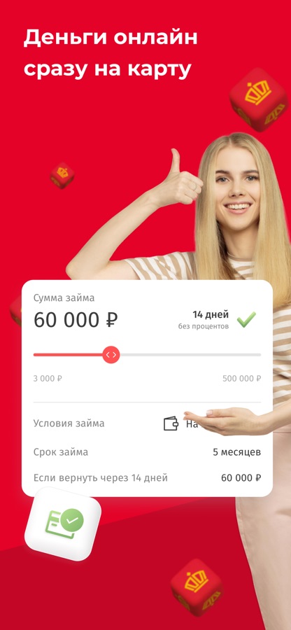 Займ выдаётся на сумму от 1000 до 70 000 ₽. Минимальный срок — 3 месяца, максимальный – 5 месяцев. Процентная ставка со дня, следующего за днем выдачи займа, и по день возврата займа включительно составляет 32,850% годовых (Диапазон значений полной стоимости займа 32,279%-32,853% годовых).